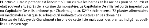 L’herbier de l’abbaye de Grandmont ne se veut pas encyclopédique mais la présentation de plantes choisies parmi celles qui étaient cultivées ou prélevées dans la nature au Moyen Age ; certaines d’entre-elles n’ayant été introduites qu’à partir du XVIe siècle. Chaque plante mentionnée est illustrée au moyen de photos auxquelles est parfois ajouté un dessin botanique Toutes sont accompagnées d’une légende qui en explique l’origine, l’utilisation culinaire ou médicale, l’usage de la plante au fil du temps, son devenir, les croyances médiévales pour certaines plantes de l’hortus (potager) et les arbres fruitiers du pomarium (verger) ainsi que d’autres croyances et théories ancrées à l’Epoque moderne pour les plantes de l’herbularius (jardin des simples).